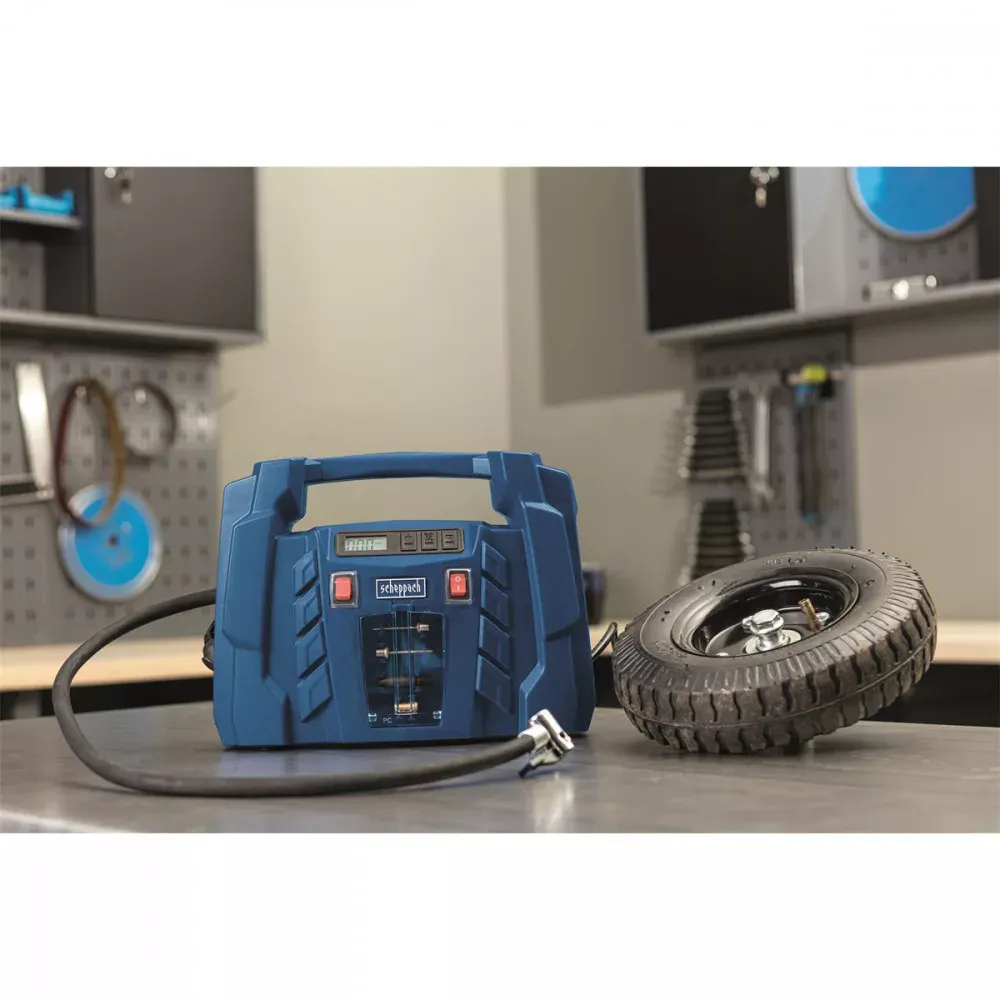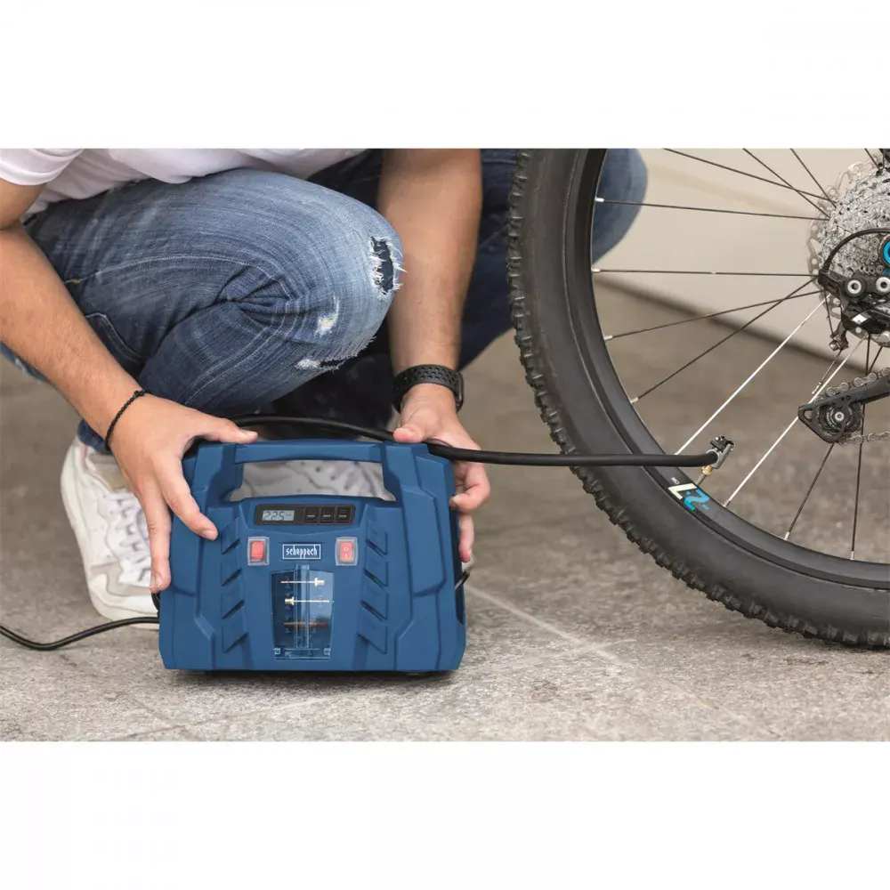 Scheppach AIR FORCE 5 este un compresor compact, dar extrem de util, ce poate fi alimentat atât de la rețeaua electrică tradițională de 230 V, cât și de la priza de 12 V a mașinilor. Este un partener de nădejde nu doar în atelier sau garaj, ci și în călătorii sau în timpul activităților în aer liber, cum ar fi campingul sau rulota. Manevrarea este simplă, iar afișajul digital indică presiunea curentă, ce poate fi reglată în intervalul de la 0,1 la 8 bari, cu oprire automată la atingerea presiunii setate.