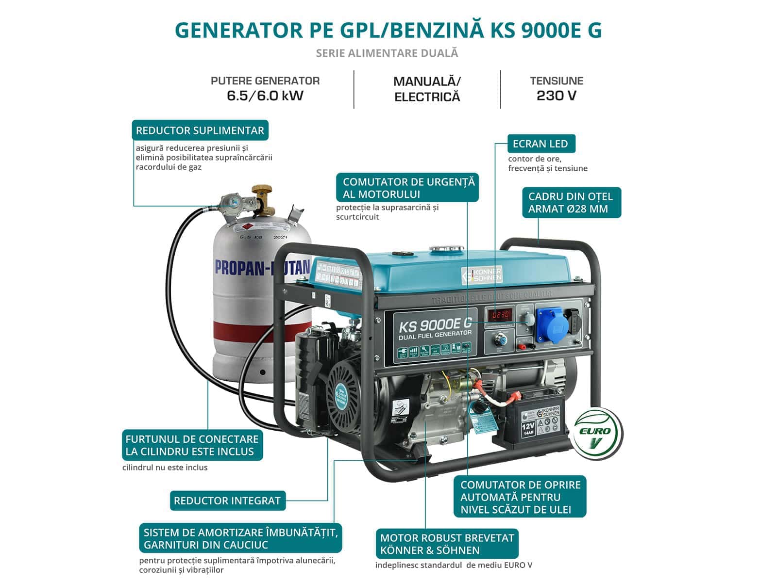 Generatoarele GPL/benzină din seria DUAL FUEL produse de Könner & Söhnen sunt în prezent cele mai populare printre clienți datorită eficienței și preocupării pentru mediul înconjurător. Generatorul poate funcționa atât pe benzină, cât și pe gaz lichefiat (propan-butan). Funcționarea generatorului pe gaz mărește durata de viață a motorului. Sunt incluse toate conexiunile necesare pentru butelie: generatorul este prevăzut cu un furtun de gaz lichefiat și două reductoare de presiune; tot ce trebuie să faceți este să conectați generatorul la butelie. Generatorul nu este compatibil cu conectarea la conducta de gaz. Dacă este necesar, modelele GPL/benzină pot fi ușor trecute la modul benzină. Motorul de mare putere K&S cu un singur cilindru în patru timpi, răcit cu aer asigură o funcționare stabilă și fiabilă a generatorului.