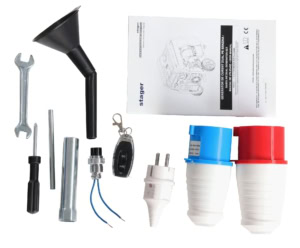 Setul de livrare standard al generatorului include un kit de transport, format din 2 roți, două piciorușe de susținere și un mâner rabatabil, prevăzut cu bolț de fixare.