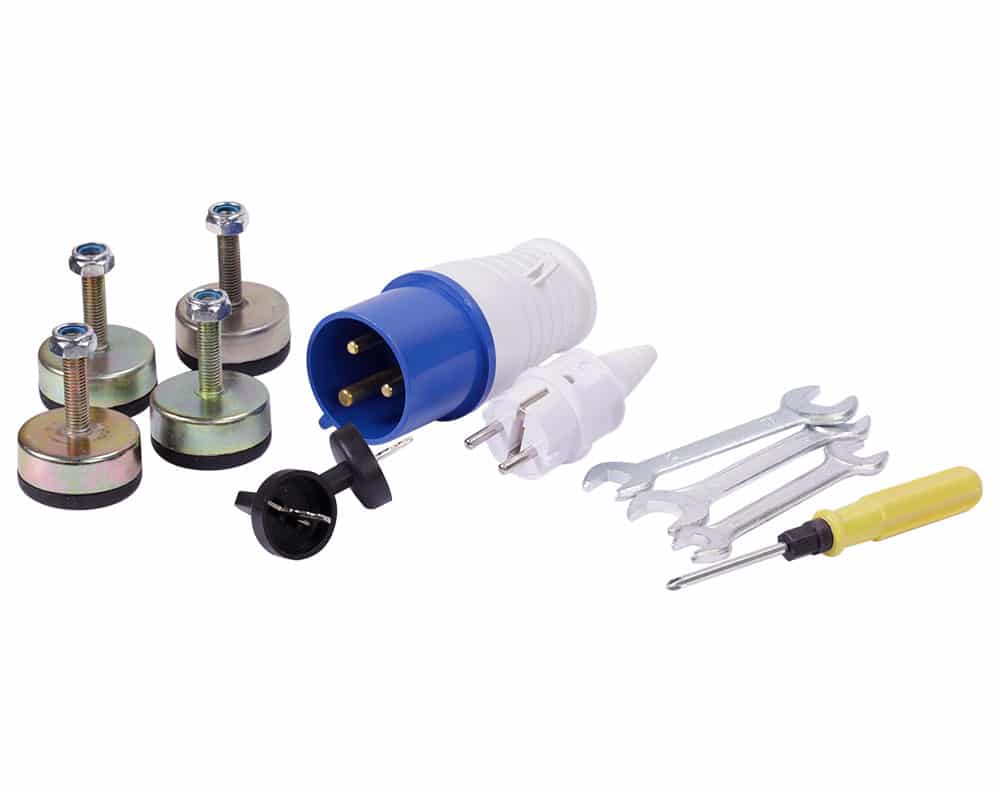 Generatorul este echipat cu accesorii suplimentare: o priză portabilă 2P+PE 16A 230V, o priză portabilă 2P+E 230V 32A, o cheie cu cârlig de 8x10mm, găuri de cheie de 12x14mm și 17x19mm și o șurubelniță PH2 cu două căi.