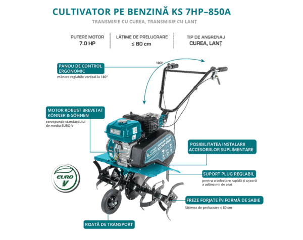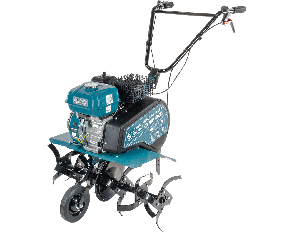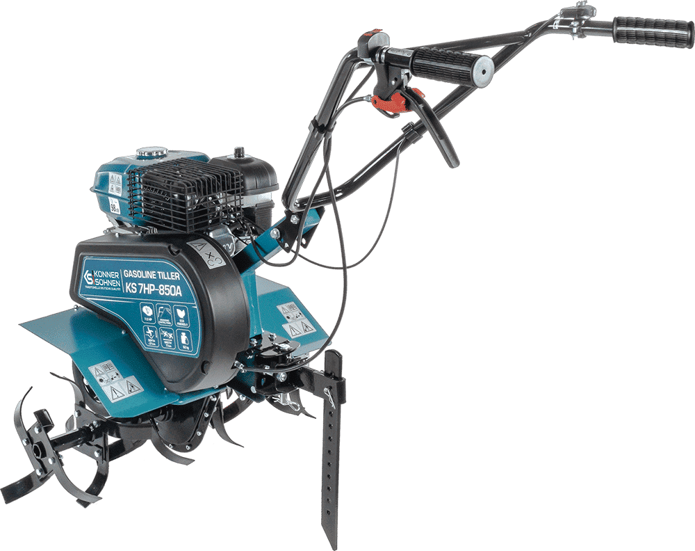 Construcția unică este realizată cu ajutorul tehnologiilor moderne, are dimensiuni compacte și un design elegant. Motoarele în patru timpi puternice și economice ale motocultoarelor Könner & Söhnen respectă normele ecologice cele mai moderne pentru emisiile de gaz de eșapament (EURO-V). Motocultoarele sunt folosite la lucrări de lungă durată și oferă o productivitate crescută. Modelul de motocultor KS 7HP-850A este compact, are roți de transport care permit manevrarea ușoară chiar și pe parcele mici de teren. Modelul permite instalarea accesoriilor suplimentare (un element de blocare, un plug dublu, un plug de scos cartofi).