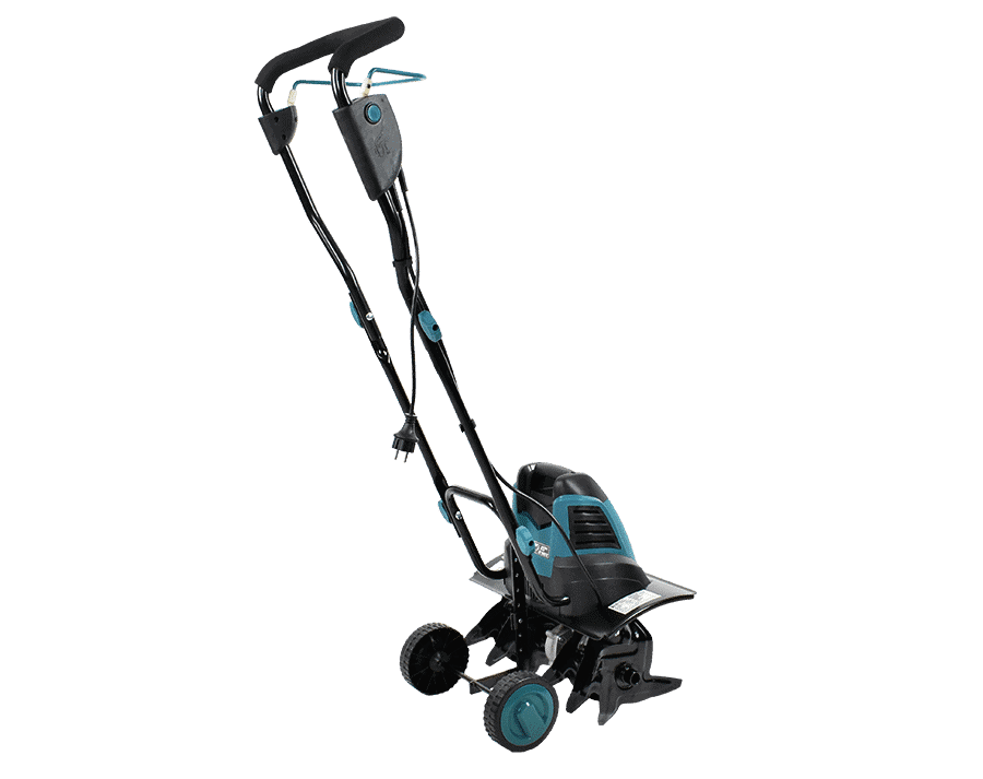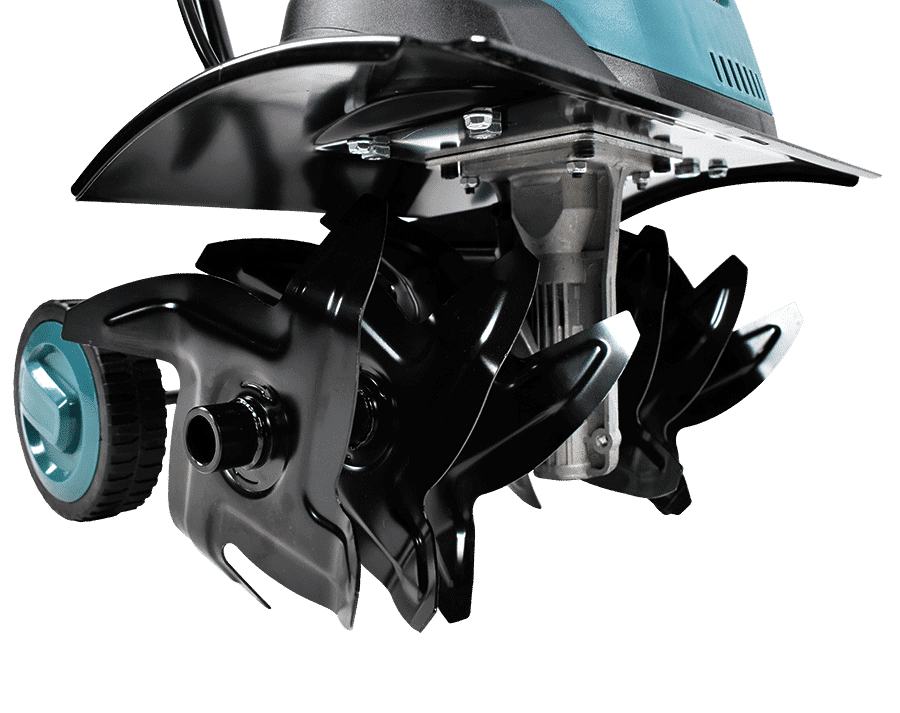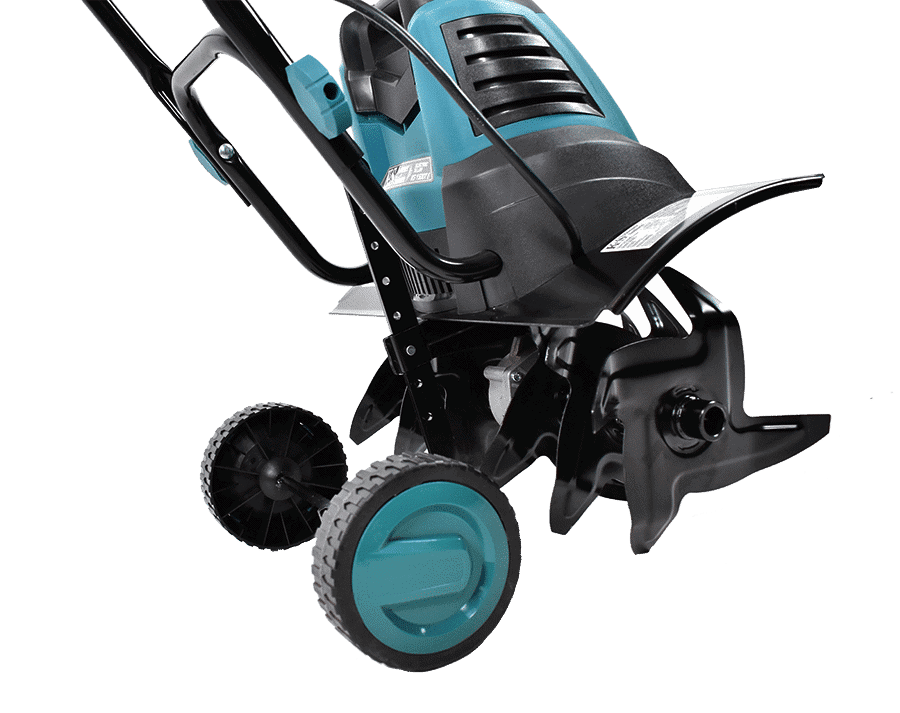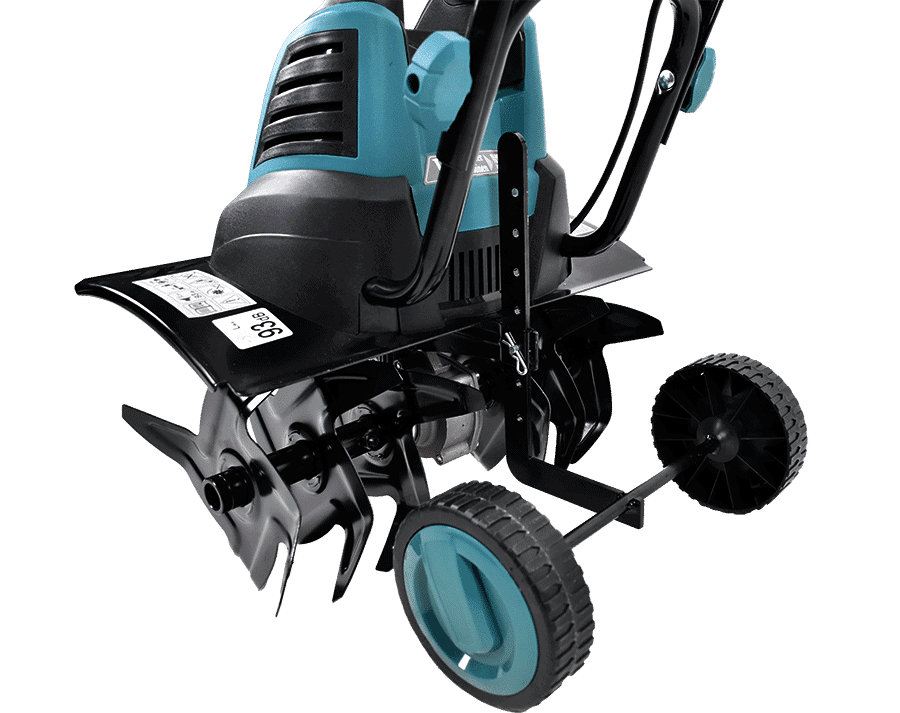Roțile mici facilitează transportul și lucrul cu motosapa.